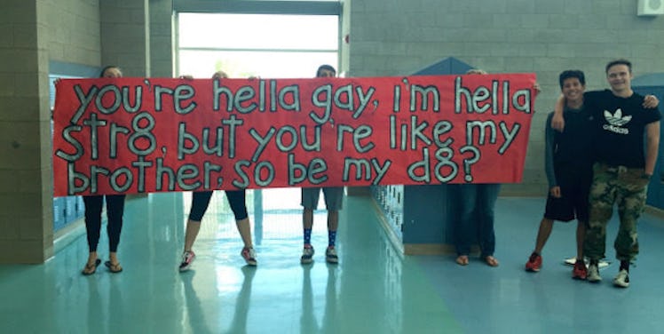 With the help of a friend named Mia, Jacob created a giant banner that read: “You're hella gay, i'm hella str8, but you're like my brother, so be my d8?”