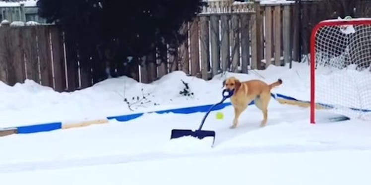 By a stroke of luck, this canine holds the shovel at just the right angle to scrape a little snow off the family's Guelph, Ontario ice rink, proving only Canadian dogs know how to shovel.