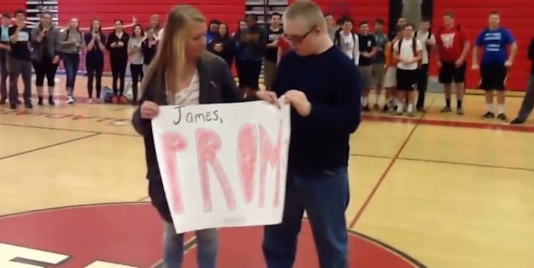 As you'll see in the video up top, Maisy recruited dozens of fellow students to help her ask James, who has Down syndrome, to be her date to the prom.