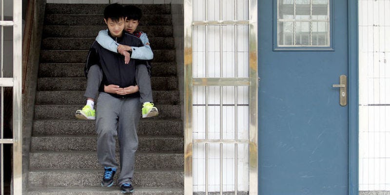 For the past three years, Xie Xu has been giving him piggyback rides to school.