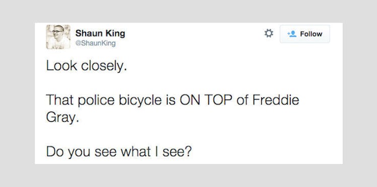 Look closely. That police bicycle is ON TOP of Freddie Gray. Do you see what I see? pic.twitter.com/wA6UOVY53L — Shaun King (@ShaunKing) April 30, 2015