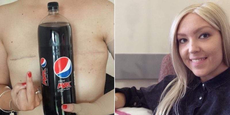 Here's my #holdacokewithyourboobchallange don't I look beautiful #breastcancer #TheCWord @youngbcblog pic.twitter.com/nvHHLkoeRz — Aimee Fletcher (@aimeefletch82) June 4, 2015