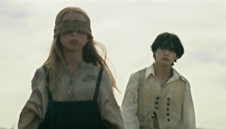 In the video, V protects a young girl from the awful aftermath of war by covering her eyes with a blindfold. He eventually takes it off when they're safe to go beyond the wall. In Netflix's Bird Box, Sandra Bullock stars as Malorie, who protects two young children from danger using a blindfold as well.