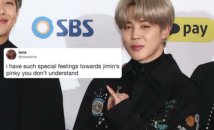 In my journey down the rabbit hole that is the corner of the internet that understands the importance of Jimin's pinkies, I was introduced to a bunch of Twitter accounts dedicated to Jimin's little finger — my favorite of which uses their artistic talents to draw Jimin's pinkies' cutest moments with a purple heart bursting from his exceptionally small pinky nail.