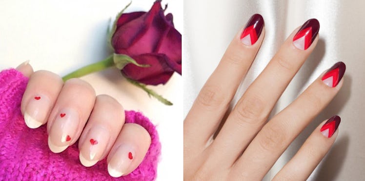 Feb. 14 is quickly approaching, and whether you're single, in a relationship, or it's complicated, I say it's a day to celebrate love no matter what. This year, show off your V-Day enthusiasm by wearing your heart on your hands. These nail art ideas for Valentine's Day are festive AF without being at all corny, so you can wear them all February long.