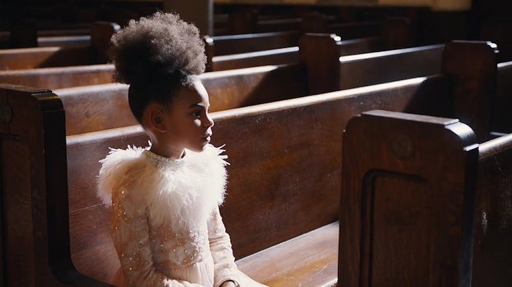 Soon after, a young Blue Ivy (played by herself) appears in church. Both young and adult versions of Blue Ivy wear matching white dresses with feathered necklines. This casting is so good.