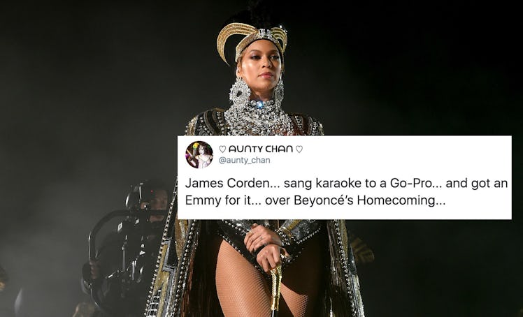 Specifically, The Late Late Show's separate 23-minute special Carpool Karaoke: When Corden Met McCartney Live From Liverpool, which aired on CBS in the summer of 2018, took home the top prize for variety specials at the Creative Arts Emmys this year — and that was a hard pill for the Beyhive to swallow. After the results of the category were announced, Beyoncé fans (and just regular pop culture aficionados in general) made their feelings known on Twitter, with most claiming it was ridiculous for a 23-minute segment of two men singing in a car to be awarded over a meticulously staged and crafted 2-hour concert documentary that has been called groundbreaking not only for music, but for social change as well.