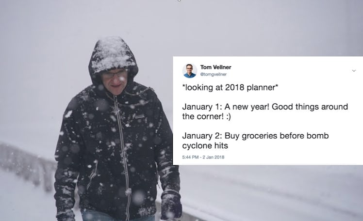 Although 2017 was — let's face it — a real drag, many of us were hoping that 2018 would bring the happiness and salvation we've all been seeking out. However, just three days into the new year, meteorologists nationwide are predicting Grayson (a "bomb cyclone") will bombard the East Coast with freezing temperatures, blustering winds, and copious amounts of freezing rain and snow. If a winter hurricane isn't the ideal start to your year (which I'll assume it's not), here are 20 funny tweets about the bomb cyclone that might make surviving the chill just a teensy bit better.