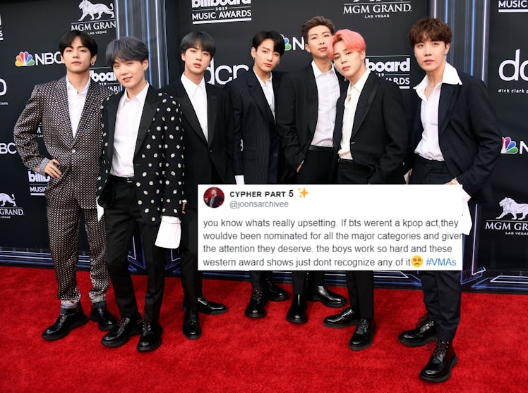 The 2019 VMA nominations have officially been announced, and while the BTS ARMY is celebrating the fact that BTS received four nominations, they also feel that the guys deserved way more, and honestly, it's hard to disagree. I mean, BTS is the biggest boyband in the world right now and they're breaking countless records left and right. One of the most notable records they've broken this year was for their "Boy With Luv" music video, which reached 74.6 million views on YouTube in 24 hours — the biggest YouTube debut in history. With an achievement like that, fans think BTS' "Boy With Luv" music video deserved nominations in the main VMA categories, and that BTS themselves should have been nominated for Artist of the Year. The tweets about BTS' 2019 VMAs nomination snubs show fans think the creation of a brand new category for K-Pop is an effort to increase voter engagement without giving the boys a chance in major categories they deserve a spot in (and have a very big chance of winning, considering their powerful, hyper-engaged fans).