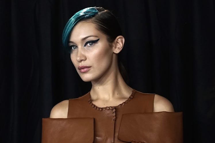 Fendi really took the 2018 graphic liner trend and ran with it. The line was thick, covering the entire expanse of the model's eyelid. The line extended all the way up toward the brow, nearly crossing the tail. There's no denying Bella Hadid looks rad AF wearing this larger-than-life look. Though liner can sometimes run the risk of making eyes look smaller, this insanely large wing actually opens up the eye and makes it look much bigger.