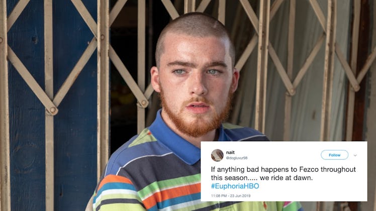 As of June 17, HBO's new drama series Euphoria is only two episodes in, and it's already been a wild ride. The show's multiple storylines follow a group of teens facing dark, dramatic, and often downright depressing issues, anchored by the main character and narrator, Rue (played by Zendaya), whose main battle is her drug addiction. But while drugs are a source of pain and isolation for Rue, her drug dealer, a high school dropout named Fezco, is actually a source of comfort and protection for fans. And these tweets about Fezco from Euphoria show that his character has quickly become a fan-favorite on the show, for a number of reasons.