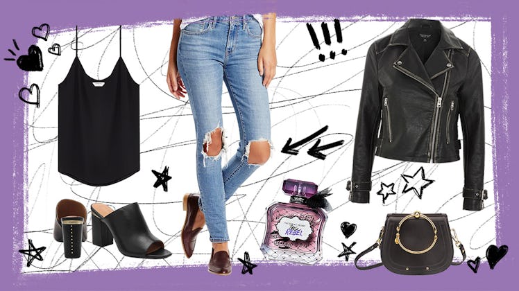 Topshop moto jacket, nordstrom.com; camisole, aritzia.com; high rise skinny jeans, levi.com; Ainifeel bracelet-handle bag, amazon.com; Calvin Klein sandals, dsw.com; Victoria's Secret Tease Rebel fragrance, victoriassecret.com.