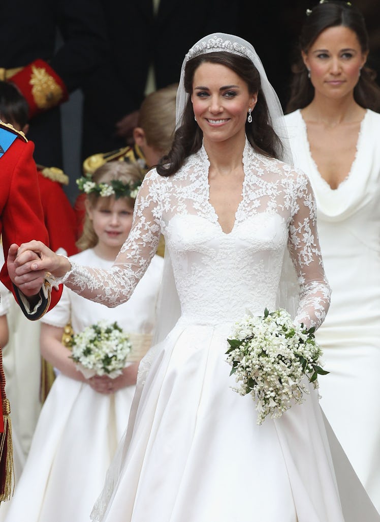 On April 29, 2011, Kate Middleton married the Duke of Cambridge wearing an Alexander McQueen gown, which is estimated to have cost over $430,000, according to CBS. With a structured, lace upper bodice, a voluminous satin skirt with a lengthy train, and a sheer lace covering for Middleton's arms and shoulders, let's just say Kate managed to successfully bridge the gap between modest expectations and Fashion with a capital F. If you don't believe me, these photos of her gown absolutely prove it.