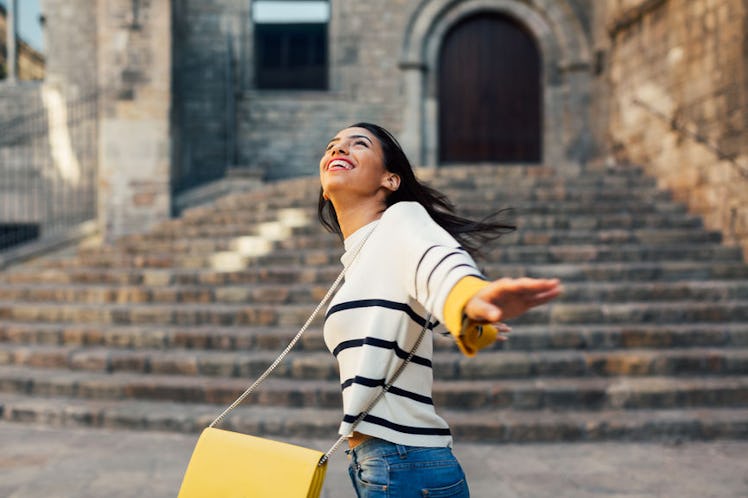 "I spend five minutes focusing on how I would like my life to look in gratitude statements," she tells Elite Daily. "'I am grateful that I got a promotion. I am grateful that I have a new dream job leading luxury yoga retreats in Costa Rica and South America.' Then I read these statements aloud." And, she adds, if she catches herself falling back into a negative-thought spiral, she simply rewrites her thoughts to be more positive.