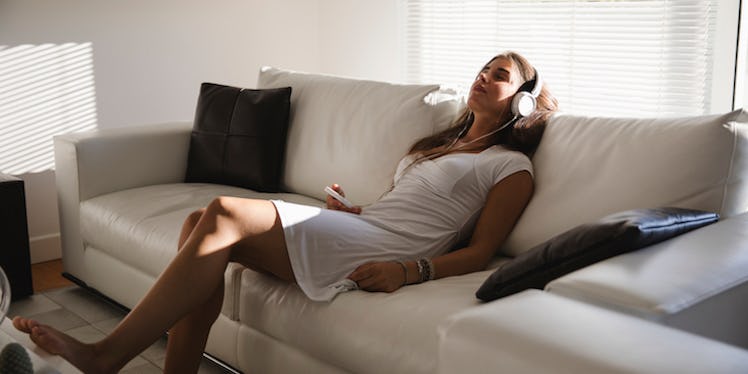 If being lazy is your favorite hobby, and you're low-key in a committed relationship with your couch, it can be hard to motivate yourself to get things done and include at least some form of productivity in your life. Alas, there are, sadly, things that must get done on a day-to-day basis — but that doesn't mean you can't accomplish them while still doing the absolute bare minimum. For instance, there are a few yoga poses you can do on the couch so that you can sloth it out, catch up on your favorite Netflix shows, and get some super casual movement into your day all at once.