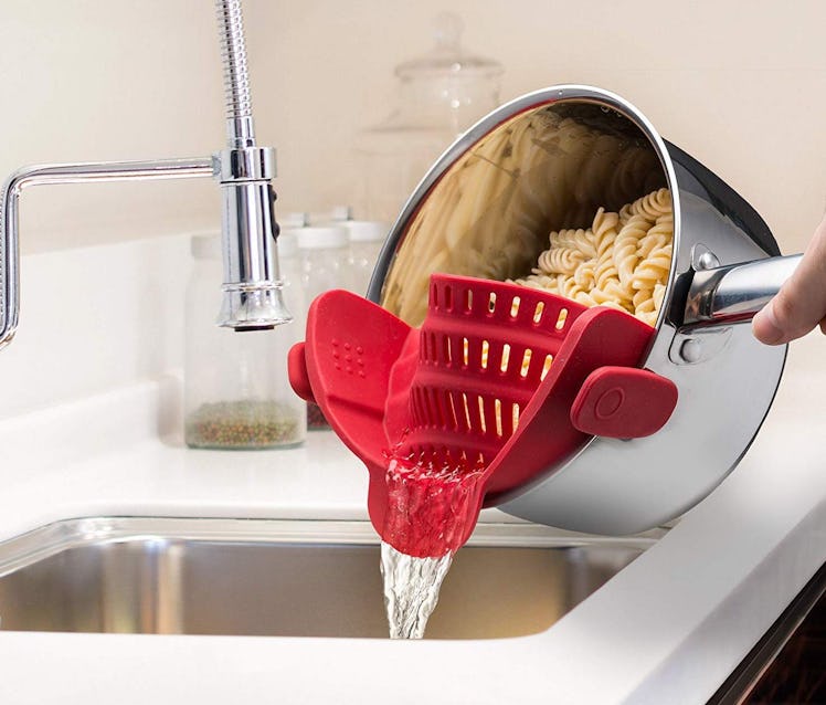 It's able to fit onto pots, pans, and bowls of varying sizes (including those with a lip) — and the Kitchen Gizmo snap strainer helps save you precious kitchen storage space, because it's significantly more compact than a traditional strainer. Completely BPA-free, it's made from high-quality silicone, which makes it exceptionally durable — plus, you can even leave it attached to the pot while you cook, since it's also heat-resistant.
