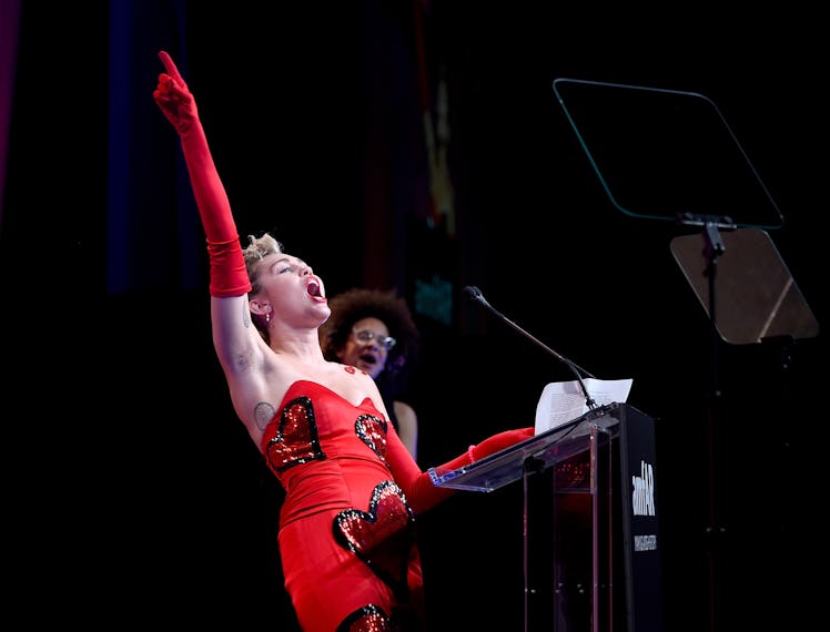 If there's any celeb you can bank on backing movements that uplift women and encourage them to be unapologetically themselves, it's Miley Cyrus. The "Younger Now" singer has been posting body hair pics on her social pages and donning the look in public, for years now. In 2015, Cyrus even stepped onto the American Foundation for AIDS Research (amfAR) Inspiration Gala stage flaunting the fact that she'd paired armpit hair with couture. Whoever said stubble can't be stunning was sadly mistaken.