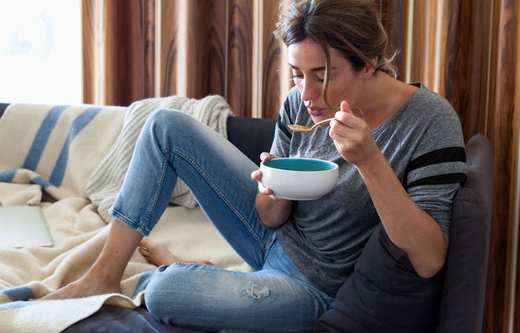"A smoothie can feel soothing to a sore throat, and the main ingredient in most smoothies — fruit — is hydrating," she tells Elite Daily. "I like to make a berry smoothie with frozen strawberries, which provide immunity-helping vitamin C."
