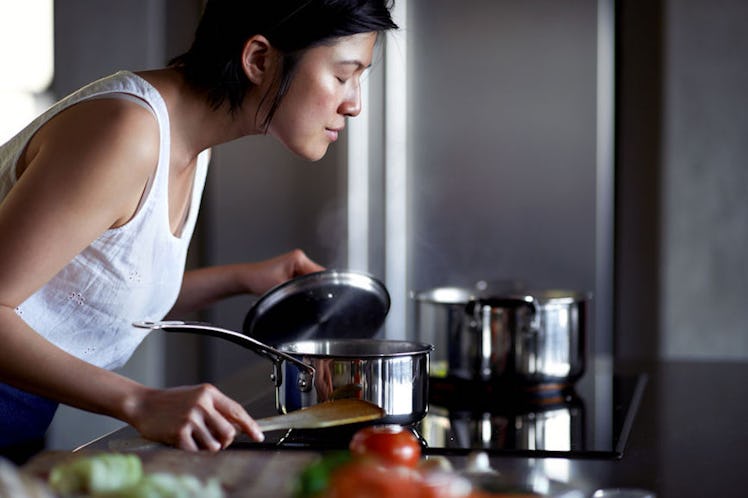 If you're dealing with a stuffy nose, the more flavor you put into your food, the better your chances are of actually tasting it even without your normal sense of smell. "Hands-down, raw garlic and raw oregano will zap just about anything quickly," Holly Harding, an integrative nutrition health coach and founder of O’o Hawaii, tells Elite Daily. "Garlic in particular has a compound called allicin. This compound has been shown to boost the disease-fighting response of some types of white blood cells in the body when it encounters viruses such as the common cold or flu."
