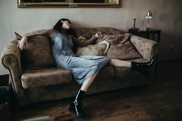Ah, a couch version of your classic spinal twist. Starting on your back, keep your legs straight in front of you. Bend the leg that's closest to the back of the couch, then draw and cross it over your body. Keep both shoulders grounded. Switch sides by laying your head at the opposite side of the couch.