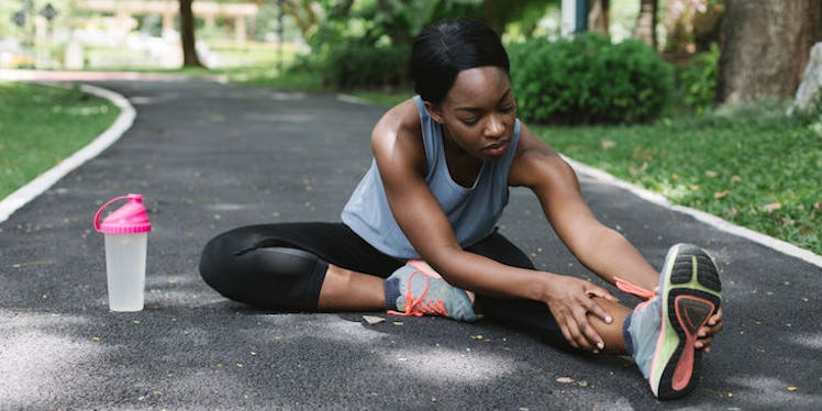 To soothe the sore feels, though, the doctor recommends doing some simple dynamic stretching to get ready for your run. "Dynamic stretching helps loosen your muscles and tendons to warm up your body and increase range of motion," he says. "Some basic examples of this are squat thrusts, running in place, jumping jacks, and lunges."