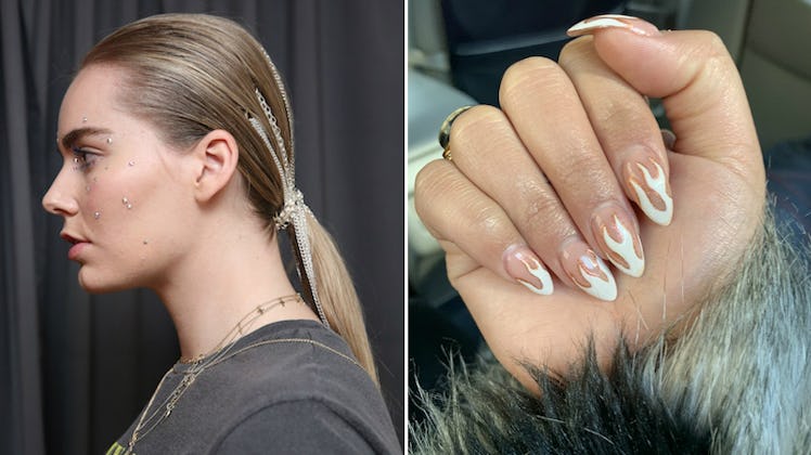 Statement manicures were everywhere on both the runways and the streets. Editorial manicurist Miss Pop created graphic newspaper print nails for Jeremy Scott's show, with polishes from essie, and the CND team created a plethora of statement press-ons for The Blonds' show that featured glitter, chains, rhinestones, and much more.