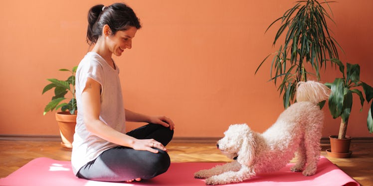 As a self-proclaimed, dog-obsessed yoga enthusiast, when I went to goat yoga the other week (yes, it's a thing), I couldn't help but high-key wish the fuzzy farm animals would be replaced with adorable little doggos. Like, picture being in downward facing dog, surrounded by literal puppies — goals times 10, amirite? So, I decided to look up some photos of dogs doing yoga to satisfy my fantasy of incorporating some seriously adorable pups into all of my yoga flows, and I was not disappointed.