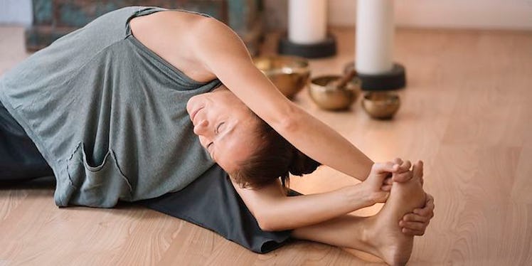 Reclining bound angle pose is incredibly restorative, and the pose will put you right back to bed when your beauty sleep has been rudely interrupted.