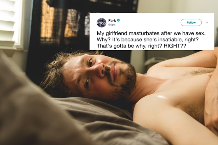 Fellas, I have a little sexual tip for you. Now, I'm no sexual health expert, but I can tell you with some confidence that, if your girlfriend is masturbating after intercourse every time, it's probably not the best sign. Now, there are some other reasons she could be doing this. But, realistically, the most probable reason why she's doing this is because you're not satisfying her in bed. For most people, this would be common knowledge. But not for one dude who straight-up asked a sex columnist at The Guardian: "My girlfriend masturbates after we have sex. Why?"