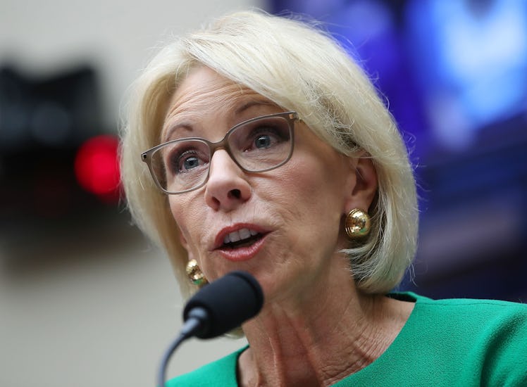 DeVos has repeatedly come under fire, not just for the administration's policies on LGBTQ harassment in schools, but for the general welfare of students facing discrimination. In February, the Department of Education announced that it won't investigate bathroom and locker room complaints from trans students, per NPR. Department spokeswoman Liz Hill told NPR in February that "Title IX prohibits discrimination on the basis of sex, not gender identity." Critics of the department's move have said that the policy is unbelievably cruel and leaves vulnerable transgender and gender nonconforming students unprotected.
