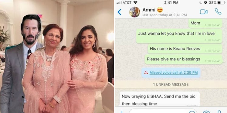 "Mom," Haider texted her mother according to the screenshots she shared on Twitter, "Just wanna let you know that I'm in love. His name is Keanu Reeves. Please give me ur blessings." At that point, it's important to note that Haider's phone showed a missed call from her mother, but then, her mom texted her back. And really, you should see the exchange for yourself: