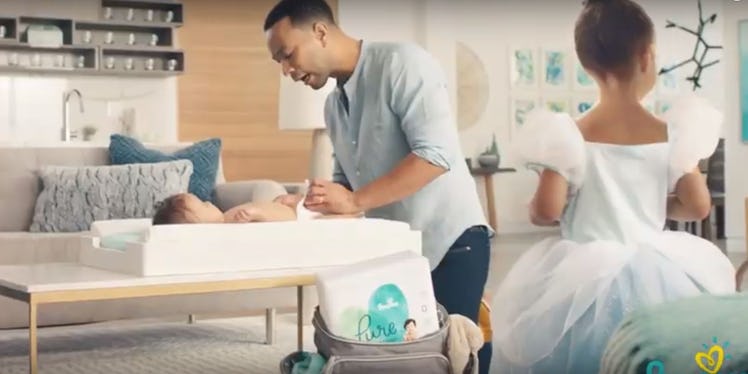 Now he's putting these skills to work for Pampers. Check out the Pampers' first Super Bowl commercial featuring John Legend, Chrissy Teigen, and another famous dad — Adam Levine.