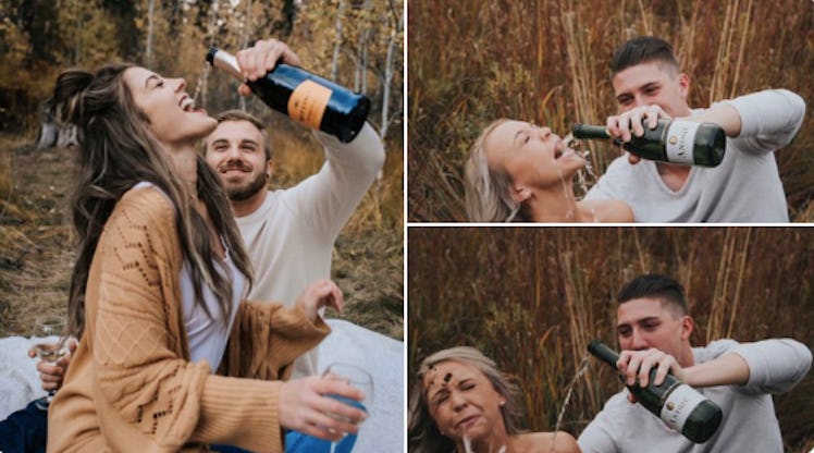 Shortly after the proposal, the time came to snap some engagement pictures. Snodsmith had already done her research going into their shoot with their photographer Chandler Lefever. Snodsmith had found a picture on Pinterest that she was particularly interested in emulating — this photo of a man lovingly pouring champagne into his betrothed's mouth taken by Brianna Bender Photography.