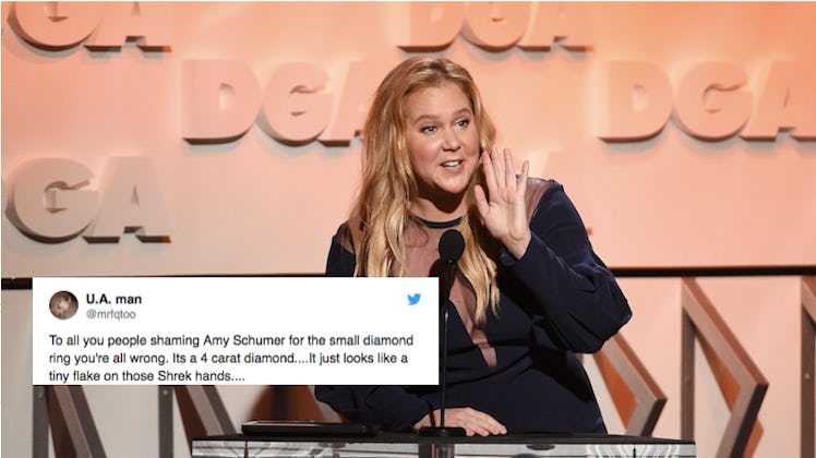 "That sure is a tiny chip in her ring," wrote one Facebook commenter. "Hmm. Hold on.........my eye sight must be going," added another. Really guys? So petty and rude! And as if that wasn't bad enough, more keyboard warriors took to Twitter to shame not just the size of the ring, but also the size of Schumer's hands and her body.