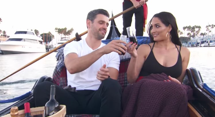 To be honest, the date itself looks a little forced (a la The Bachelor, obvi). Peter and Bella float around in a romantic gondola, forcibly clink wine glasses, and then eventually end up on a couch where Peter goes in for the kiss. Viewers hear a voiceover from Nikki explaining, "I don't know if I'm ready for this."