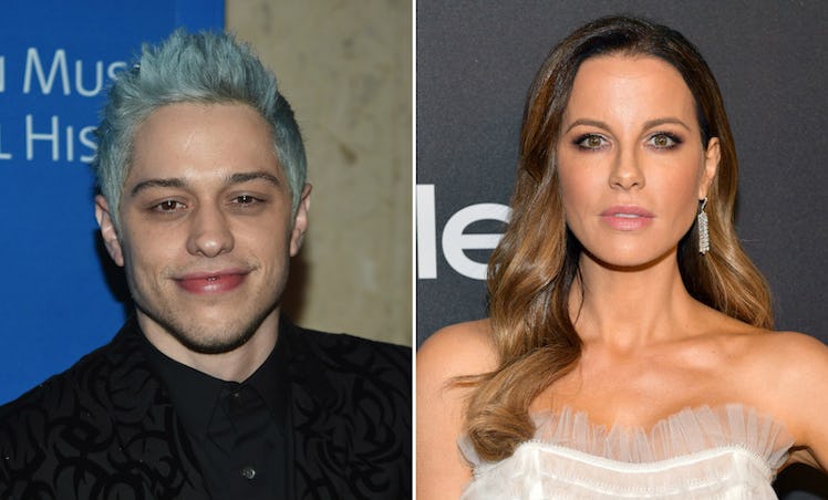 OK, OK, OK. We get it, universe. You have an invested interest in keeping us on our toes with Pete Davidson. The Saturday Night Live comedian recently broke-up with his former fiancé, Ariana Grande, and has reportedly been pretty damn bummed about it. However, that might all be changing. Thanks to new eyewitnesses lurking at a Golden Globes after party, someone new might have caught Davidson's eye. Due to some recent headlines, people are asking — Are Pete Davidson and Kate Beckinsale dating? Yes, you read that right. Kate Beckinsale and Pete Davidson were reportedly spotted flirting the night of Sunday, Dec. 7, and people are paying the F attention. Elite Daily reached out to both Davidson and Beckinsale's reps for comment but did not hear back by the time of publication.