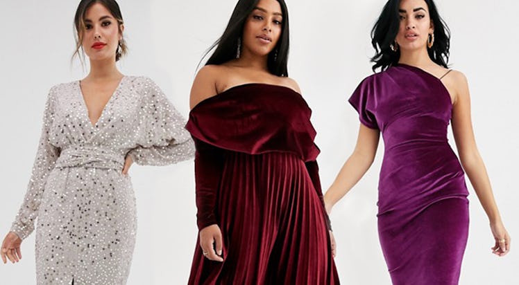 For an off-the-shoulder fit, the ASOS DESIGN Curve Velvet Long Sleeve Bardot Pleated Midi Dress in Oxblood ($80, ASOS) would look incredible paired with a great necklace and a lil' collarbone highlight: