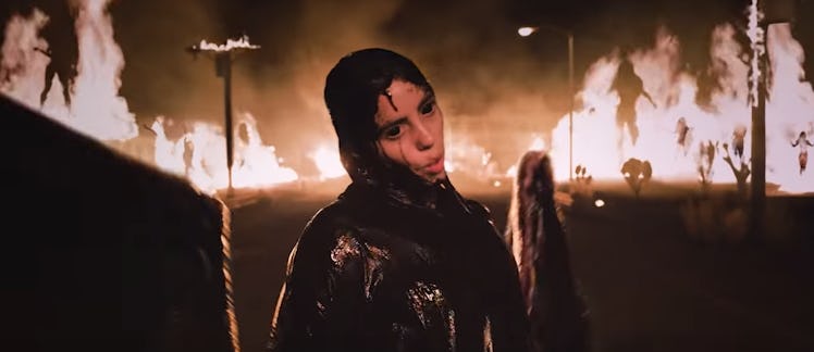 On Sept. 4, Eilish dropped the terrifyingly cool visual for her track "All The Good Girls Go To Hell." It begins with Eilish being injected in the back with tons of syringes. The formula causes her to sprout gloriously large wings that appear almost angel-like, but a split-second later, Eilish falls from the all-white room through the cloud-filled blue sky (which I'm going to liken to a "fall from grace"), and crashes into a tar pit on Earth, which is basically hell because it's on fire. Eilish struggles to get out of the pit before emerging wide-eyed and covered in the thick, black substance as the song starts with the familiar line, "My Lucifer is lonely."
