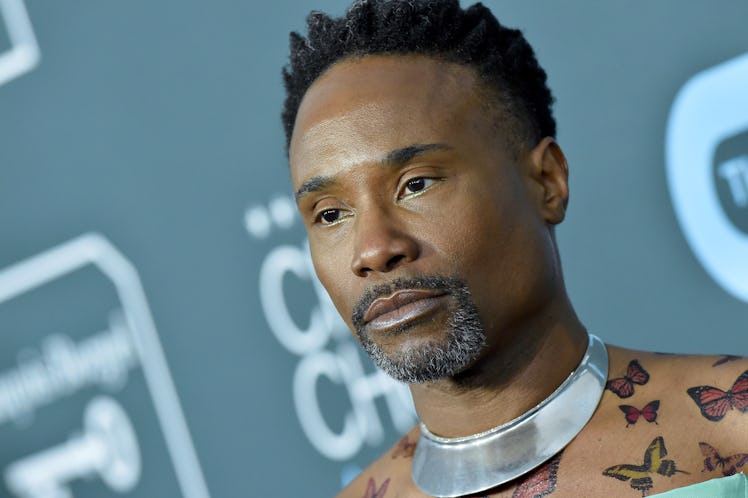 Billy Porter graced the Critics' Choice Awards red carpet rocking a trend from the 1990s that is making a major comeback — and no, it wasn't his outfit or even accessories. Porter's 2020 Critics' Choice Awards look featured a two-tone, strapless jumpsuit by Hogan McLaughlin that was seafoam green in the front and teal in the back. Porter paired the look with thick silver arm cuffs, chunky silver rings, and a matching choker collar. What really made his look memorable, though, were the individual temporary butterfly tattoos lining his chest, back, and arms, courtesy of Porter's makeup artist and groomer, Anna Bernabe.
