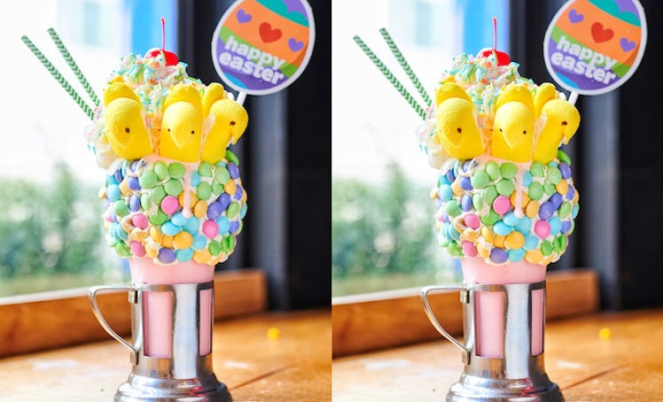 Per press materials, you can expect a "whimsical cherry shake which features a vanilla frosted rim coated with Easter M&Ms and topped with three iconic Yellow Peeps Chicks, whipped cream, Easter sprinkles and a cherry on top!" when you order one of these limited-edition shakes.