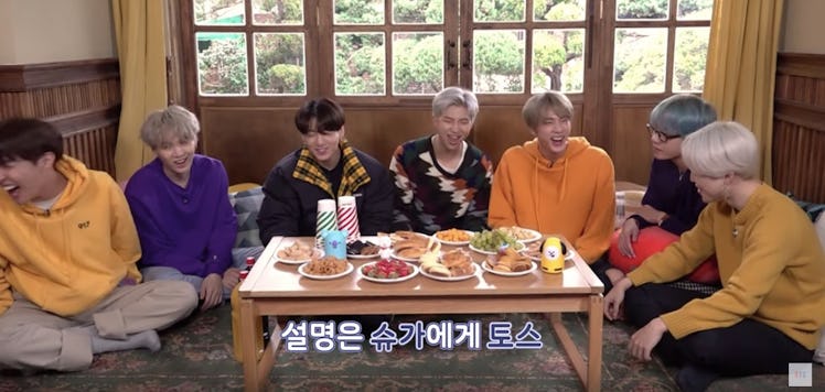 This year's celebration is a bit modest compared to 2018's Dinner Party where the boys gathered at a pop-up restaurant and conversed over fancy foods and booze together. Actually, when "Bangtan Attic" first kicks off, Jungkook jokingly acknowledges the lack of spirits. "We don't get any booze," he says, holding up a bottle of grape juice and orange juice. The boys are all seated on the floor around a table stacked with miscellaneous snacks like strawberries, Oreos, grapes, and bread.