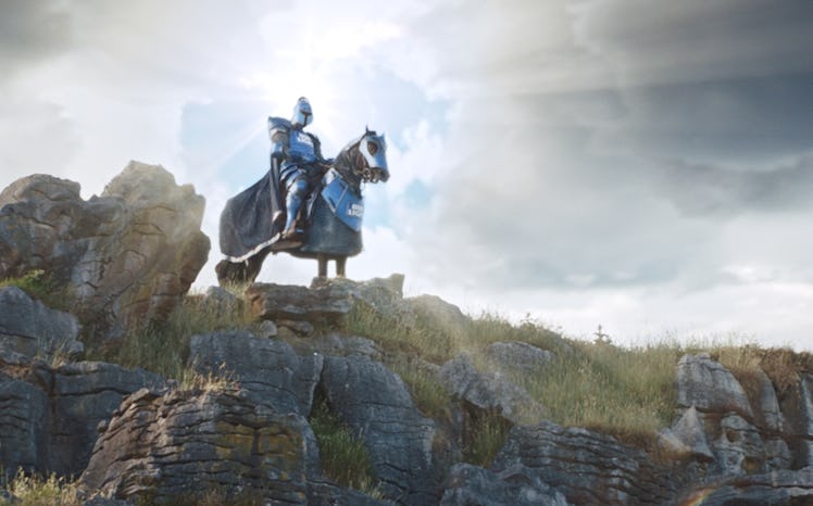 The final Bud Light commercial that finishes the Dilly Dilly trilogy is called "But Knight," and it's pretty damn theatrical. Almost immediately, the minute-long clip cuts to a violet battles full of dragons, fires, and swords. Then, amid the chaos, the Bud Knight enters the scene. The Bud Knight is basically just a super buff knight with the Bud Light logo on his armor (simple, but genius). Once he shows up on his horse atop a cliff, everyone stops fighting and stares at him in awe. By the looks of it, everything thinks the Bud Knight will save them.