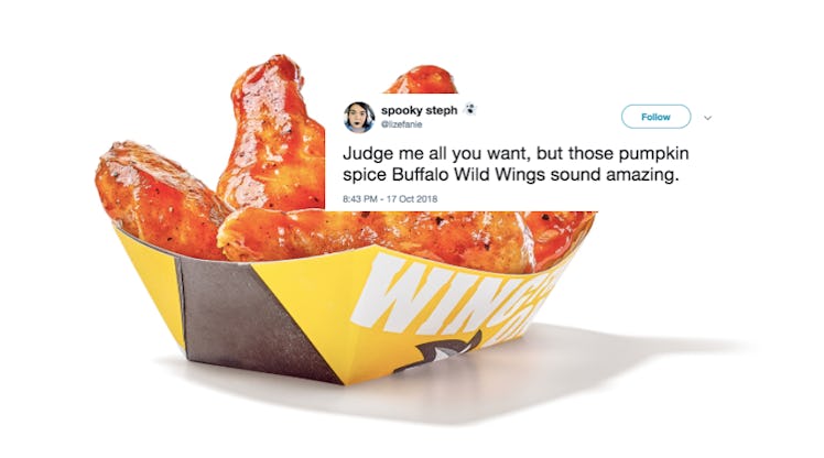 Let's talk about pumpkin spice. Many deem it "basic," due to its undying popularity, but regardless of its reputation, I'm shamelessly a sucker for it. And whether you like it, love it, or totally hate it, you have to admit that pumpkin spice was quite literally made for seasonal drinks, cakes, breads, and all kinds of snack foods. Fans have even started experimenting with integrating pumpkin into savory foods, like chicken wings. Most recently, Buffalo Wild Wings' Pumpkin Spice Wings debuted at BBW restaurants, and like most things, they have Twitter completely divided.