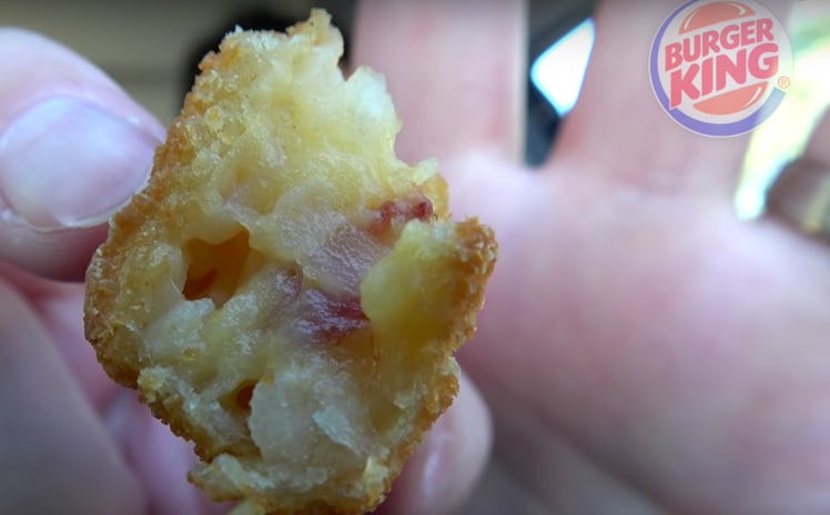 TBH, I was one of the Cheesy Tot faithfuls who couldn't even fathom that there might be something better than the original. That is, until Peep THIS Out! revealed that bacon-filled Cheesy Tots now exist for an extra savory and hickory-smoked take on the fan-favorite menu item. According to Chew Boom, participating locations will carry the cheesy goodness. Elite Daily reached out to Burger King for further comment on the Cheesy Tots with bacon, but did not hear back at the time of publication.