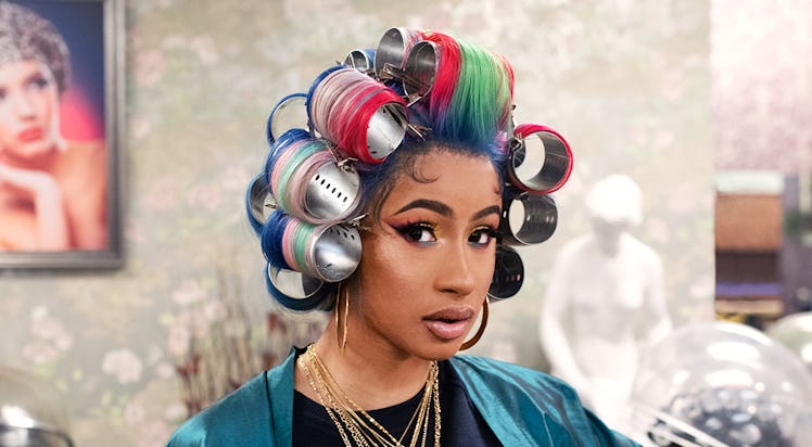The commercial opens with Cardi's rainbow strands done up in rollers, as she sits under an old-school salon dryer chair chatting with a friend about a boy who isn't hitting her up. Relatable content if I've ever seen it! As for her OOTD, Cardi is rocking a Reebok logo shirt cut into a crop top (Naturally!), some white Reebok kicks, light wash jeans, and tons of gold belts and jewels.