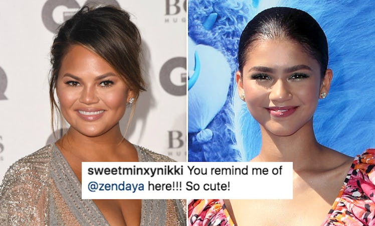 In fact, Chrissy Teigen's childhood photo is somewhat of a phenomenon in its own right. Immediately after Teigen posted it, fans noticed how similar she looked to a young Zendaya. It's gotta be something about their facial shape and feature symmetry, but still. It's... spooky? In the photo, a super sweet and youthful Teigen is casually smiling at a camera. Her shirt says, "It's not easy being cute." Hilariously, Teigen captioned the photo, "It really isn't." In just 12 hours, it gained nearly 700 thousand likes and lots of "Zendaya, is that you?!" comments.