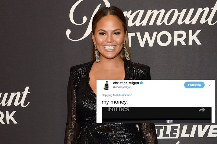 OK, like WHAT?! Who even are you, and why are you ragging on Chrissy Teigen? And what is up with that rando compliment tacked onto the end of your tweet? Is that like writing "LOL" at the end of an obnoxious text to try an negate its real meaning? Because I am SO onto you, man. This poor dude clearly had no idea know who he was messing with here, and it was only a matter of time before Teigen rolled up on Twitter to eloquently and succinctly let him know who's boss — and who was named the third highest paid model in the world by Forbes.