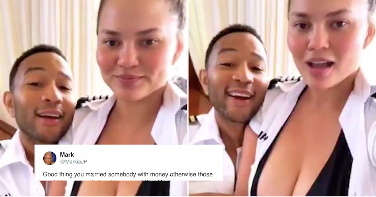 Chrissy Teigen reminded us all once more that she's just like us by posting a Twitter video that involves her love for the Bravo television series Below Deck. In the video, we see Teigen sitting on her husband John Legend's lap, looking gorgeous as anything in a nautical-inspired white button-up. In the video, Teigen starts off by saying, "I'm the chief stew," and John Legend adds, "I'm the captain." Tiegen yells, saying, "No! You're the bosun! God!"