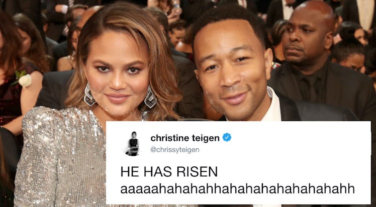 John Legend may be Jesus Christ on TV this Easter, but over on Twitter, our true lord and savior is, as always, Chrissy Teigen. While her husband was delivering the performance of a lifetime on Jesus Christ Superstar Live in Concert, Teigen was serving up all the jokes and behind-the-scenes scoop about the musical special. Seriously, if you weren't following Chrissy Teigen's tweets about Jesus Christ Superstar Live on Sunday night, then you were only getting half of the full experience.