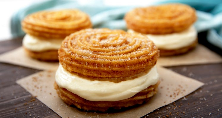 Churros are fried strips of dough coated in cinnamon sugar. They've got that melt-in-your-mouth quality about them, which is what makes the Churro Ice Cream Sandwich a real standout in the world of desserts. Cinnabon is taking it to the next level by rolling them up and baking them in the oven. Adding ice cream to the mix really just takes this dessert something special. The Churro Ice Cream Sandwich will only be around for a limited time, so have at it while you still can. It's available at select Cinnabon locations that serve Carvel Ice Cream.